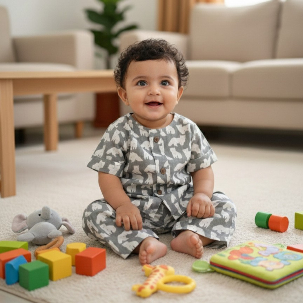 Give your baby the softest, most comfortable bedtime with Piggy Tales' baby cotton night suit sets — printed sleepwear designed especially for newborns and infants. Our infant nightwear collection features 9 adorable designs with fun animal and vehicle prints — playful elephants, cute pandas, curious koalas, wise owls, gentle lions, bicycles, tractors, and construction vehicles — all crafted in 100% pure cotton that's ultra-soft, breathable, and safe for your baby's delicate, sensitive skin. Each set is designed for easy dressing and diaper changes, with a relaxed fit that lets your little one move, stretch, and sleep comfortably through the night. Unlike polyester blends found in most budget baby nightwear, our pure cotton night sets won't trap heat, keeping your baby cool during warm Indian nights and cozy when layered in winter.